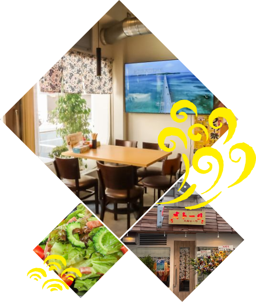 花ブロック、シーサー、宮古島の石、琉球瓦風カウンターなど、見て楽しい、感じてうれしいこだわり空間。