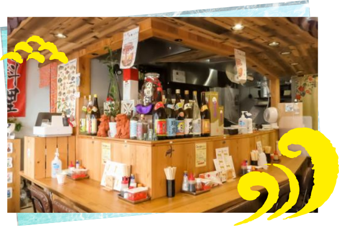 琉球民謡が流れる店内には、沖縄の海が映る大型テレビ、三線、琉球瓦風のカウンターなど現地の空気感がたっぷり。